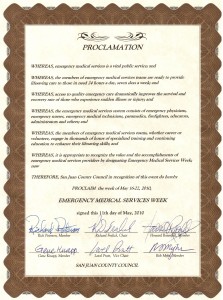 “Whereas, the members of emergency medical services teams are ready to provide lifesaving care to those in need 24 hours a day, seven days a week; and Whereas, access to quality emergency care dramatically improves the survival and recovery rates …,” stated the San Juan County Council Proclamation. “It is appropriate to recognize the value and the accomplishments of emergency medical services providers by designating Emergency Medical Services Week.”